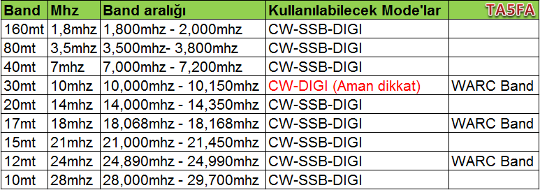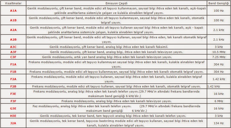 "Yalnız birinci öncelik Ülke planı dahilinde hareket ve kullanım olmalıdır" nedir bu ülkemizdeki plan derseniz aşağıdaki listeden görebiliriz. Son sütundaki emisyon "Modülasyon" tipi olarak nitelendirebiliriz.
