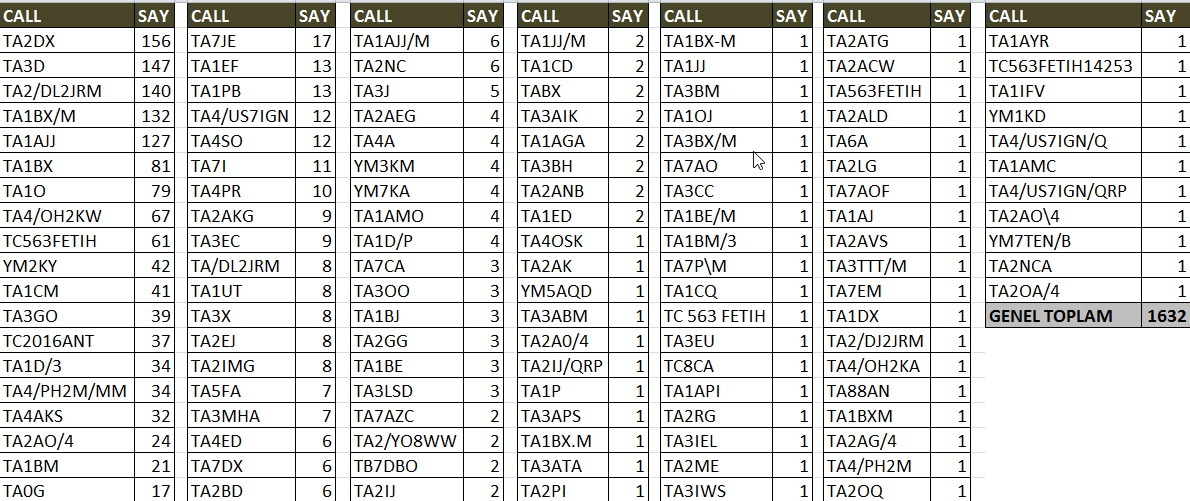 Sayılar ile TA (eksik karakter ve yanlış spot çağrı işaretlerini dikkate almayınız)