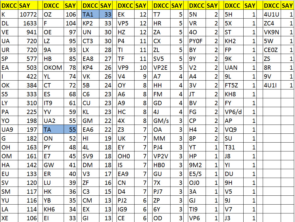 DXCC artı WAE Ülkeleri : WAE: IT, GM (Shetland Islands), JW (Bear island), TA1 (European Turkey), 4U1VIC, Z6 Kosova.