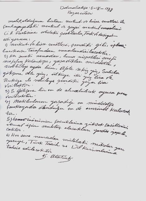 Atatürk, vasiyetini Dolmabahçe Sarayı'nda hazırladı.
